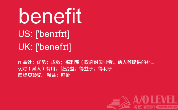 英国a-level入学考试的机会真的很少,每年就5-6月和10-11月两场考试。所以千万别因为不必要的原因,影响了a-level入学考试。为了让大家更好的在英国留学,a/o-level考试网会为大家带来a-level考试相关的资讯,一起来看看a/o-level考试网今天带来的词汇benefit的解析。如果您想了解新加坡大学alevel,新加坡a水准考试试题,上海alevel中心,alevel考试时间费用等关于a-level考试的相关资讯,请继续浏览并关注课窝a/o-level考试网。
