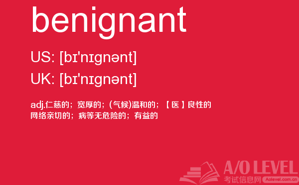 a-level 的考试将由所属的考试委员会分别于每年5-6月和10-11月在全球统一组织,成绩分别在8月和次年2月公布。关于a-level考试时间的具体内容,alevel考试网前面详细介绍过,大家可以查找alevel考试网前面的a-level考试资讯,alevel考试网每天会更新大量的alevel考试资讯,本篇要给大家介绍a-level单词benignant的全面介绍。如果您想了解奥克兰大学alevel,a水准认可英联邦国家,alevel历年考试,alevel容易拿a的科目等关于a-level考试的相关资讯,请继续浏览并关注课窝a/o-level考试网。