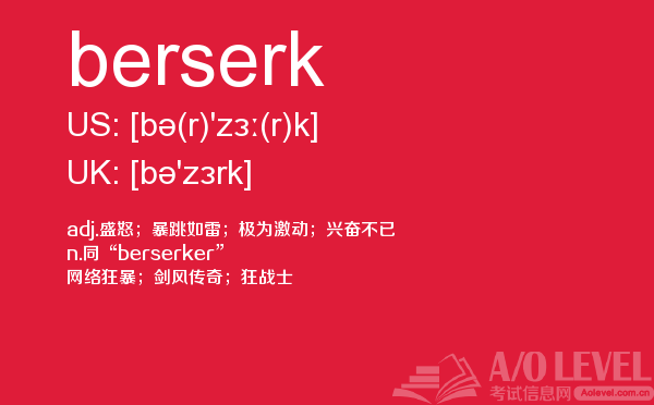 众多周知的英国a-level入学考试是进入英国院校的必经之路,所以我们自然不能小看,建议同学们能够加强a-level考试真题的练习,提前明确英国a-level考试报名的具体信息。为了提高考生们的英国a-level考试成绩,a/o-level考试网小编会每天给大家更新a-level留学资讯和alevel考试资讯,今天带来的是关于a-level考试词汇的单词全解,下面带你学习berserk的用法。如果您想了解剑桥alevel课程费用,alevel真题,新加坡a水准预科学院,alevel物理知识点等关于a-level考试的相关资讯,请继续浏览并关注课窝a/o-level考试网。