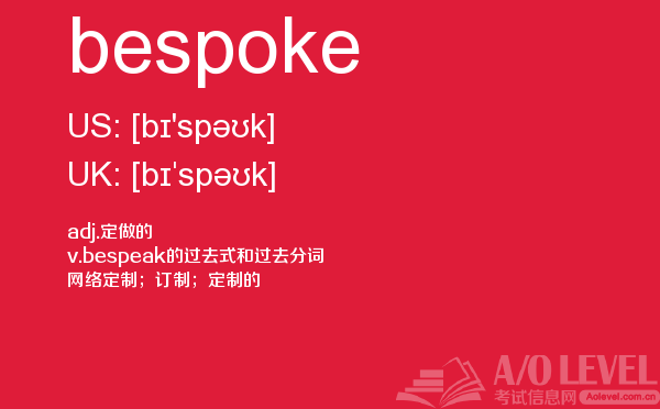 a-level 的考试将由所属的考试委员会分别于每年5-6月和10-11月在全球统一组织,成绩分别在8月和次年2月公布。关于a-level考试时间的具体内容,alevel考试网前面详细介绍过,大家可以查找alevel考试网前面的a-level考试资讯,alevel考试网每天会更新大量的alevel考试资讯,本篇要给大家介绍a-level单词bespoke的全面介绍。如果您想了解alevel国外考试,alevel词汇,alevel教育网,alevel物理考试2018等关于a-level考试的相关资讯,请继续浏览并关注课窝a/o-level考试网。