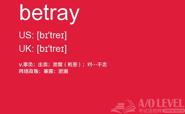 a-level课程包含70多门供学生选择,一般学生选择3至4门来学,中国学生在数学学科上有很大的优势,一般学生都会选择基础数学。学生选择课程时,一般要考虑现在自己的优势科目和将来的发展方向,即你想选择哪个大学、什么专业,从而根据他们的要求有的放矢地选课。关于alevel选课后续会详细介绍,下面带来a-level考试词汇betray的详细介绍。如果您想了解alevel怎么自学,a水准数学,alevel考试指南,alevel自学选什么等关于a-level考试的相关资讯,请继续浏览并关注课窝a/o-level考试网。