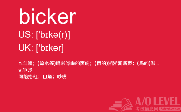 a-level的成绩分为a、b、c、d、e、u六个等级,a为最优,e为通过,u为不及格。如果学生对某门课的成绩不满意,可以选择重考,最终成绩以最好的一次为准。那么a-level考试想要取得a-level高分大家需要做到哪些呢?a/o-level考试网给大家带来的很多a-level考试经验,alevel考试技巧等等,想要考好a-level考试,不仅要知道这些,对于关于a-level考试的所有资讯都需要了解,最重点的是a-level词汇量的积累,今天a/o-level考试网就给大家带来的a-level的考试单词bicker的全面解析。如果您想了解新加坡a水准优势,国内alevel培训班,alevel学校名单,alevel真题网站等关于a-level考试的相关资讯,请继续浏览并关注课窝a/o-level考试网。