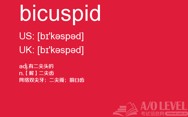 a-level(general certificate of education advanced level ),英国高中课程,是英国全民课程体系,是英国普通中等教育证书考试高级水平课程,也是英国学生的大学入学考试课程。今天alevel考试网小编给大家带来的alevel考试单词bicuspid的详细介绍。希望大家能够认真的阅读。如果您想了解了解alevel培训,国际部高中课程alevel,查询alevel考试报名信息2018,墨尔本大学alevel要求等关于a-level考试的相关资讯,请继续浏览并关注课窝a/o-level考试网。