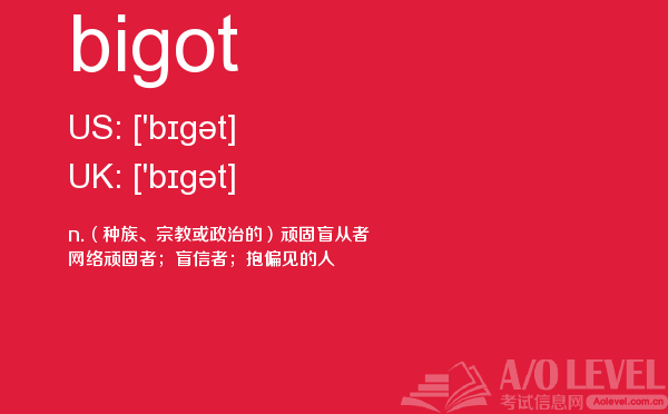 英国高中课程(a-level)的学制为两年:第一年称为as水准,学生通常选择自己最擅长且最有兴趣的3—4门课,通过考试后获得as证书。第二年称为a2水准,学生可选择as水准中优秀的3门课继续学习,通过考试后获得a-level证书。关于a-level学制相信大家肯定有一定的了解,今天alevel考试网想要带大家了解的并不是a-level学制的问题,想要介绍的是a-level重难点单词bigot,希望对大家有帮助。如果您想了解alevel培训中心,英国alevel排名,alevel历年真题,alevel官方网站等关于a-level考试的相关资讯,请继续浏览并关注课窝a/o-level考试网。