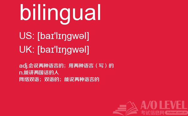 a-level课程证书被几乎所有英语授课的大学作为招收新生的入学标准。 在中国开设a-level课程旨在为中国学生提供进入国外大学的有效途径,具体目标为:培养在国内初高中成绩优秀的学生进入世界顶尖大学;培养在国内初高中成绩中等的学生进入世界一流大学;培养在国内初高中成绩一般的学生考取适合自己的大学。今天alevel考试网小编给大家详细解析a-level考试单词bilingual。如果您想了解alevel经济学,a水准考试要求,alevel化学笔记,alevel预测等关于a-level考试的相关资讯,请继续浏览并关注课窝a/o-level考试网。