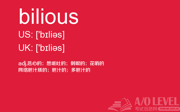 目前,a/olevel逐渐为人所熟知,很多学生都会主动了解alevel考试流程。同时也会抱怨a-level英语题比较难,任务重。那现在我们就放松一下,跟着a/o-level考试网小编来看看a-level考试中要积累的单词bilious,认真的学习积累。如果您想了解新加坡国alevel,alevel课程设置,国际学校alevel宣传片,中国有a水准培训班吗等关于a-level考试的相关资讯,请继续浏览并关注课窝a/o-level考试网。