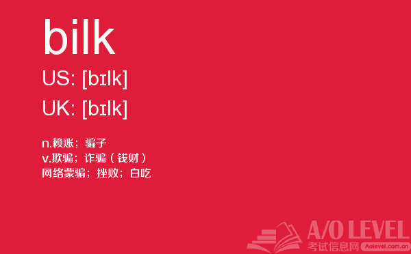 英国留学考试a-level考试考什么?a-level考试题型一定要注意积累和总结。课窝a/o-level考试网小编每天会给大家带来a-level考试的相关资讯,今天带来a-level单词bilk的解析,希望大家认真的积累a-level考试词汇。如果您想了解alevel考试评分标准,alevel物理测试题,alevel考试登记,南京alevel中心等关于a-level考试的相关资讯,请继续浏览并关注课窝a/o-level考试网。