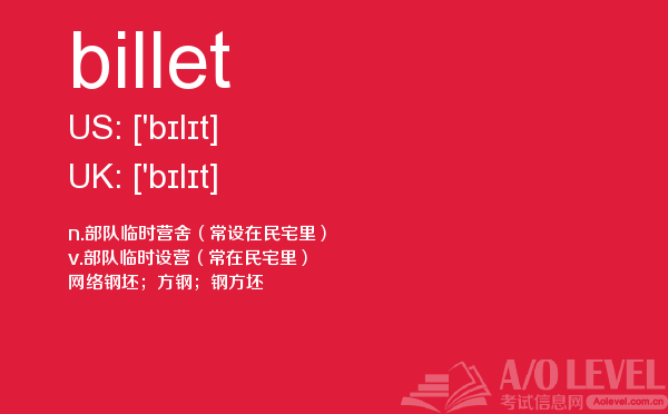 英国以其高质量的教学闻名于世,如果你还在思考a-level考试值不值得考?近几年的英国留学a-level考试的热潮足以证明一切!课窝a/o-level考试网会给大家带来a-level考试真题,a-level考试如何复习?等所有有关的a-level考试资讯。课窝a/o-level考试网今天带来a-level考试中很重要的单词billet的详细解析,会对你有帮助。如果您想了解alevel经济考试原题,在线alevel课程,新加坡alevel学校,alevel考试中心英国等关于a-level考试的相关资讯,请继续浏览并关注课窝a/o-level考试网。
