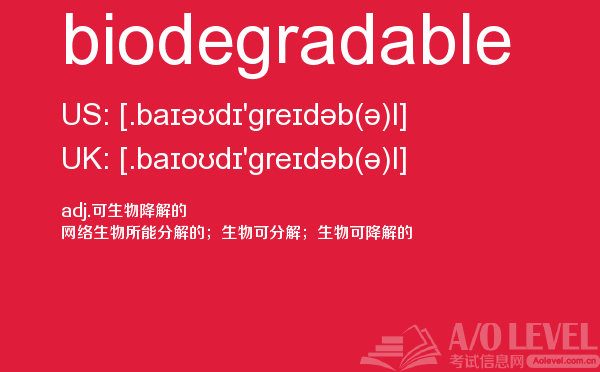随着英国留学申请竞争的白热化,a-level成绩在学生个人简历中扮演的“入场券”角色,变得越来越重要。然而,在你参加a-level考试培训班前,你首先要对a-level考试有着一定的了解,一起跟着a/o-level考试网来看看小编今天带来a-level单词biodegradable的详细介绍。如果您想了解alevel辅导班,alevel学校什么时候招生,新加坡读a水准,alevel有什么好学校等关于a-level考试的相关资讯,请继续浏览并关注课窝a/o-level考试网。