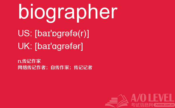 英国a-level考试是英国留学生去英国留学需要参加的考试,很多考生担心a-level考试分数要求高,英国a-level考试难度大,别担心,只要认真的学习a-level考试内容,小编相信大家一定能够考得a-level高分。今天a/o-level考试网给大家带来单词biographer的全面解析。如果您想了解爱德思alevel答案,a水准成绩,新加坡a水准数学考试,alevel培训费等关于a-level考试的相关资讯,请继续浏览并关注课窝a/o-level考试网。