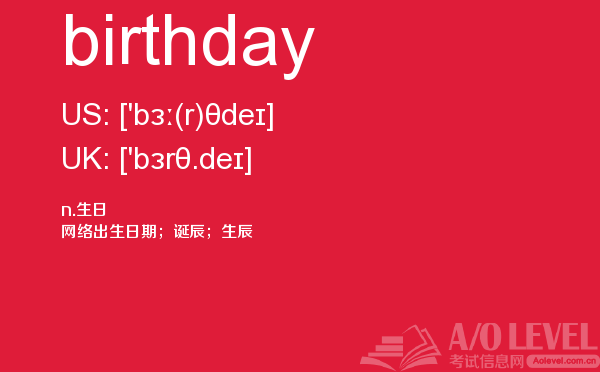 a-level课程包含70多门供学生选择,一般学生选择3至4门来学,中国学生在数学学科上有很大的优势,一般学生都会选择基础数学。学生选择课程时,一般要考虑现在自己的优势科目和将来的发展方向,即你想选择哪个大学、什么专业,从而根据他们的要求有的放矢地选课。关于alevel选课后续会详细介绍,下面带来a-level考试词汇birthday的详细介绍。如果您想了解alevel怎么自学,a水准数学,alevel考试指南,alevel自学选什么等关于a-level考试的相关资讯,请继续浏览并关注课窝a/o-level考试网。