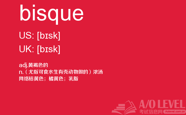 a-level课程证书被几乎所有英语授课的大学作为招收新生的入学标准。 在中国开设a-level课程旨在为中国学生提供进入国外大学的有效途径,具体目标为:培养在国内初高中成绩优秀的学生进入世界顶尖大学;培养在国内初高中成绩中等的学生进入世界一流大学;培养在国内初高中成绩一般的学生考取适合自己的大学。今天alevel考试网小编给大家详细解析a-level考试单词bisque。如果您想了解alevel考试报名时间,新加坡a水准试题,alevel考试是什么,alevel教材下载等关于a-level考试的相关资讯,请继续浏览并关注课窝a/o-level考试网。