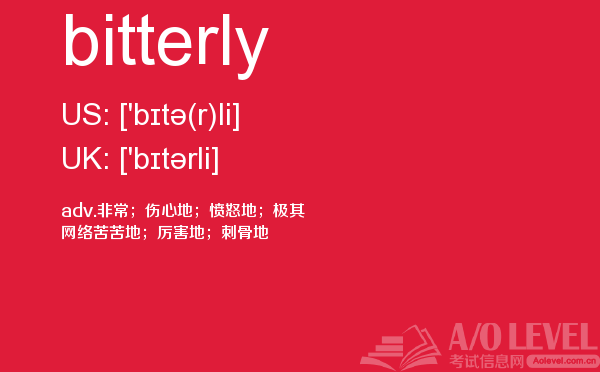 英国a-level入学考试的机会真的很少,每年就5-6月和10-11月两场考试。所以千万别因为不必要的原因,影响了a-level入学考试。为了让大家更好的在英国留学,a/o-level考试网会为大家带来a-level考试相关的资讯,一起来看看a/o-level考试网今天带来的词汇bitterly的解析。如果您想了解alevel考试费,alevel阅读,一年读完alevel,南京alevel课程辅导等关于a-level考试的相关资讯,请继续浏览并关注课窝a/o-level考试网。