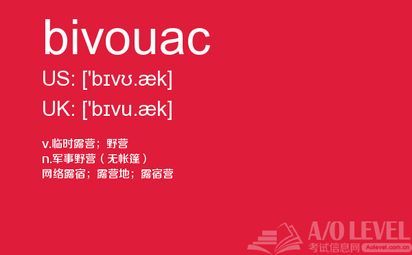 英国a-level入学考试的机会真的很少,每年就5-6月和10-11月两场考试。所以千万别因为不必要的原因,影响了a-level入学考试。为了让大家更好的在英国留学,a/o-level考试网会为大家带来a-level考试相关的资讯,一起来看看a/o-level考试网今天带来的词汇bivouac的解析。如果您想了解alevel是机考吗,alevel培训学费,剑桥alevel课程,alevel物理讲义等关于a-level考试的相关资讯,请继续浏览并关注课窝a/o-level考试网。