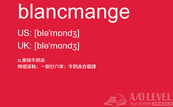 目前,a/olevel逐渐为人所熟知,很多学生都会主动了解alevel考试流程。同时也会抱怨a-level英语题比较难,任务重。那现在我们就放松一下,跟着a/o-level考试网小编来看看a-level考试中要积累的单词blancmange,认真的学习积累。如果您想了解alevel非全日制培训,新加坡a水准好考吗,爱德思alevel中国官网,爱德斯alevel等关于a-level考试的相关资讯,请继续浏览并关注课窝a/o-level考试网。