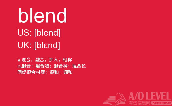 虽然英国a-level院校招生官常把“成绩不是决定录取与否的唯一因素”挂在嘴边,但不得不承认,a-level分数是学生优秀与否的有力证据,取得a-level成绩高分是肯定是优先考虑的。放松一下,先跟着a/o-level考试网来看看今天小编带来的是a-level单词blend的介绍。如果您想了解考alevel有年龄限制吗,alevel课程难吗,新加坡最好的a水准预科学校,上海alevel辅导等关于a-level考试的相关资讯,请继续浏览并关注课窝a/o-level考试网。