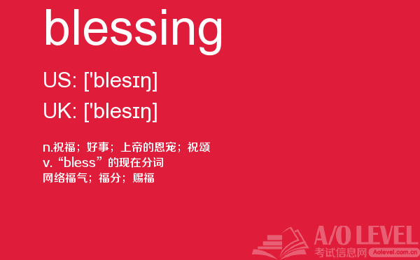 英国a-level考试是英国留学生去英国留学需要参加的考试,很多考生担心a-level考试分数要求高,英国a-level考试难度大,别担心,只要认真的学习a-level考试内容,小编相信大家一定能够考得a-level高分。今天a/o-level考试网给大家带来单词blessing的全面解析。如果您想了解alevel到底是什么课程,alevel考试要求,新加坡a水准好考吗,alevel网课等关于a-level考试的相关资讯,请继续浏览并关注课窝a/o-level考试网。