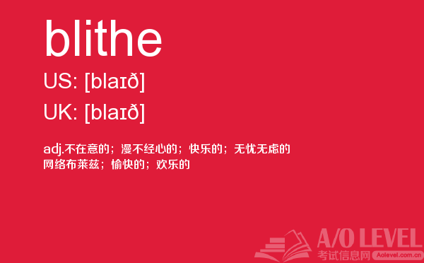 英国留学对于留学成绩的比拼越来越激烈,申请英国院校留学的一大指标a-level考试分数要求也水涨船高.虽然成绩只是申请的一部分,但不得不说,好看的英国a-level成绩是学生是否优秀的证据。放松一下跟着a/o-level考试网来学习一下a-level考试词汇blithe的应用。如果您想了解高中alevel考试,alevel物理常备词汇,alevel非全日制培训,alevel是毕业考试吗等关于a-level考试的相关资讯,请继续浏览并关注课窝a/o-level考试网。