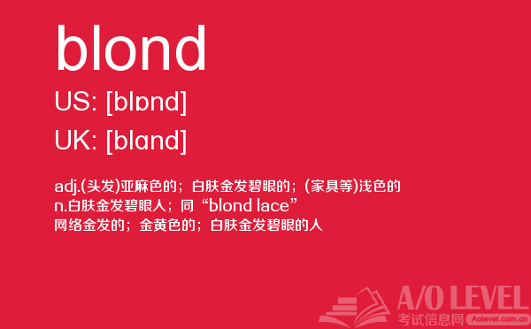英国a-level入学考试的机会真的很少,每年就5-6月和10-11月两场考试。所以千万别因为不必要的原因,影响了a-level入学考试。为了让大家更好的在英国留学,a/o-level考试网会为大家带来a-level考试相关的资讯,一起来看看a/o-level考试网今天带来的词汇blond的解析。如果您想了解澳大利亚alevel,alevel物理难吗,在线alevel培训,alevel报名网站等关于a-level考试的相关资讯,请继续浏览并关注课窝a/o-level考试网。