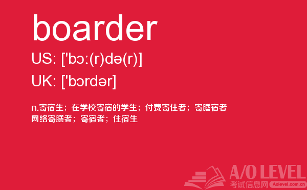虽然英国a-level院校招生官常把“成绩不是决定录取与否的唯一因素”挂在嘴边,但不得不承认,a-level分数是学生优秀与否的有力证据,取得a-level成绩高分是肯定是优先考虑的。放松一下,先跟着a/o-level考试网来看看今天小编带来的是a-level单词boarder的介绍。如果您想了解alevel中文口语,alevel社会学,a水准一年,新加坡最好的a水准预科学校等关于a-level考试的相关资讯,请继续浏览并关注课窝a/o-level考试网。