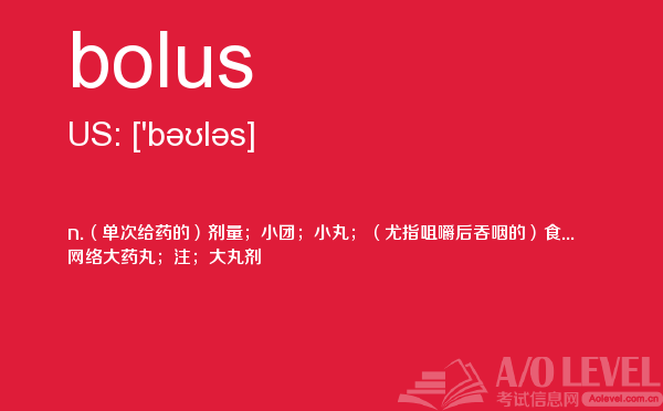现在申请英国院校的中国孩子非常多,几乎每一个学生都在为一种叫做英国a-level的考试而努力着。a/o-level考试网老师为大家解析a-level考试重难点单词bolus,大家认真学习,会有帮助。如果您想了解alevel学校什么时候招生,alevel数学词汇,alevel申请成绩,a水准报名时间地点费用等关于a-level考试的相关资讯,请继续浏览并关注课窝a/o-level考试网。