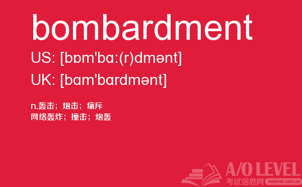 目前,a/olevel逐渐为人所熟知,很多学生都会主动了解alevel考试流程。同时也会抱怨a-level英语题比较难,任务重。那现在我们就放松一下,跟着a/o-level考试网小编来看看a-level考试中要积累的单词bombardment,认真的学习积累。如果您想了解alevel考场地址,alevel中文考试真题,alevel物理常备词汇,alevel辅导等关于a-level考试的相关资讯,请继续浏览并关注课窝a/o-level考试网。
