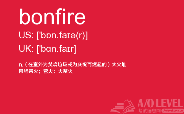 a-level(general certificate of education advanced level ),英国高中课程,是英国全民课程体系,是英国普通中等教育证书考试高级水平课程,也是英国学生的大学入学考试课程。今天alevel考试网小编给大家带来的alevel考试单词bonfire的详细介绍。希望大家能够认真的阅读。如果您想了解港大alevel申请条件,alevel中国大学,alevel成绩申请港大,alevel经济教材电子版等关于a-level考试的相关资讯,请继续浏览并关注课窝a/o-level考试网。
