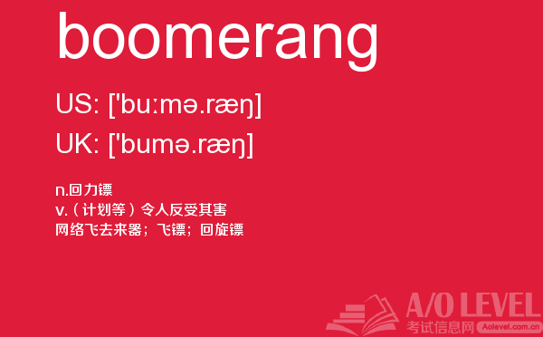 英国a-level学校,从教学质量上来看私立学校更占优势,大部分中国留学生也选择私立学校来读,不过一般都是提前一年来申请学校。中国目前也有20几所a-level学校,每年也同样有走进剑桥牛津等世界顶级大学的学生。所以在国外和在国内都可以选择a-level学校来学习。在前面关于a-level选校的问题已经详细介绍过,那么今天a/o-level考试网小编主要想介绍的是a-level重难点词汇boomerang。希望对大家有帮助。如果您想了解alevel证书,爱德思alevel真题,alevel经济2017试卷,新加坡alevel等关于a-level考试的相关资讯,请继续浏览并关注课窝a/o-level考试网。