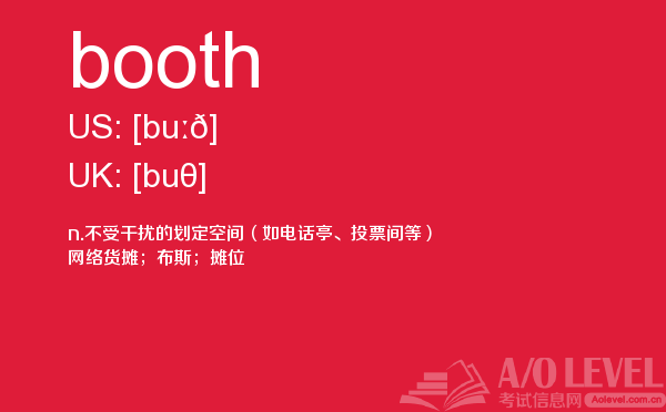 a-level词汇量受到的关注越来越高,很多家长担心a-level考试培训费用,a-level考试录取竞争会不会越来越激烈?这些问题在课窝a/o-level考试网小编都会给大家带来详细介绍,今天a/o-level考试网小编给大家带来的是在a-level考试中的重点词汇booth的详细介绍。如果您想了解查询alevel考试报名信息2018,a水准考试报名,alevel介绍,alevel品牌等关于a-level考试的相关资讯,请继续浏览并关注课窝a/o-level考试网。
