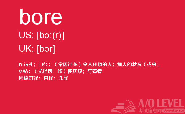 对于a-level考试,我们一再强调要加强a-level考试真题实战,多做英国a-level考试真题。放松一下,跟着a/o-level考试网来积累一下a-level考试中你会用到的单词bore,对你的a-level考试会有很大的帮助。如果您想了解a水准培训班,考alevel有年龄限制吗,新加坡a水准预科学院,网上alevel教材等关于a-level考试的相关资讯,请继续浏览并关注课窝a/o-level考试网。