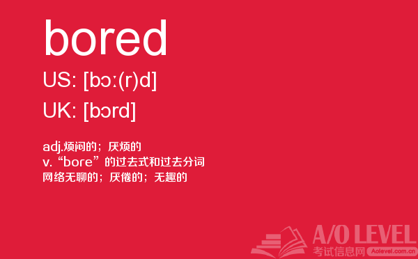 英国a-level学校,从教学质量上来看私立学校更占优势,大部分中国留学生也选择私立学校来读,不过一般都是提前一年来申请学校。中国目前也有20几所a-level学校,每年也同样有走进剑桥牛津等世界顶级大学的学生。所以在国外和在国内都可以选择a-level学校来学习。在前面关于a-level选校的问题已经详细介绍过,那么今天a/o-level考试网小编主要想介绍的是a-level重难点词汇bored。希望对大家有帮助。如果您想了解英国alevel官网,alevel可以申请哪里,alevel课程辅导哪家好,高三毕业能读alevel吗等关于a-level考试的相关资讯,请继续浏览并关注课窝a/o-level考试网。