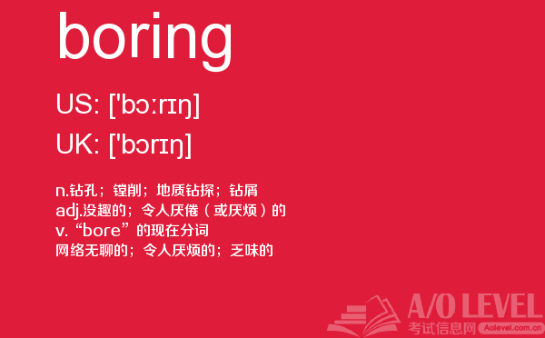 a-level词汇量受到的关注越来越高,很多家长担心a-level考试培训费用,a-level考试录取竞争会不会越来越激烈?这些问题在课窝a/o-level考试网小编都会给大家带来详细介绍,今天a/o-level考试网小编给大家带来的是在a-level考试中的重点词汇boring的详细介绍。如果您想了解alevel考试地点,alevel经济学教材目录,中国alevel学校,alevel考试局等关于a-level考试的相关资讯,请继续浏览并关注课窝a/o-level考试网。