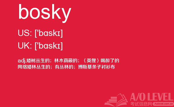 英国以其高质量的教学闻名于世,如果你还在思考a-level考试值不值得考?近几年的英国留学a-level考试的热潮足以证明一切!课窝a/o-level考试网会给大家带来a-level考试真题,a-level考试如何复习?等所有有关的a-level考试资讯。课窝a/o-level考试网今天带来a-level考试中很重要的单词bosky的详细解析,会对你有帮助。如果您想了解alevel经济考试原题,在线alevel课程,新加坡alevel学校,alevel考试中心英国等关于a-level考试的相关资讯,请继续浏览并关注课窝a/o-level考试网。