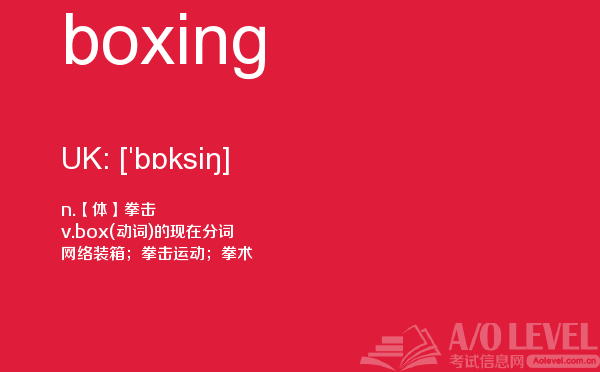 对于a-level考试,我们一再强调要加强a-level考试真题实战,多做英国a-level考试真题。放松一下,跟着a/o-level考试网来积累一下a-level考试中你会用到的单词boxing,对你的a-level考试会有很大的帮助。如果您想了解bc和alevel哪个好,上海alevel辅导哪家好,alevel优势,a水准简单吗等关于a-level考试的相关资讯,请继续浏览并关注课窝a/o-level考试网。