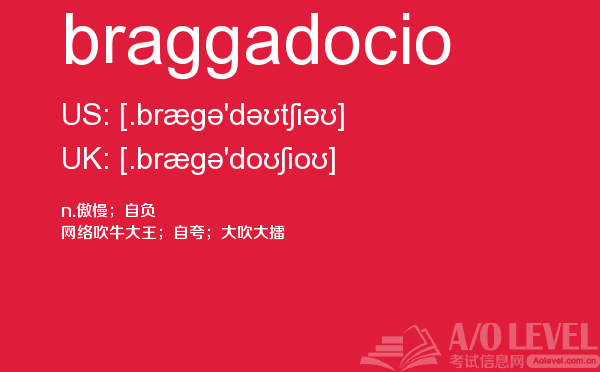 随著学生的素质提升,各大a-level课程培训班的师资和英国a-level题库也不断的完善,近年来学生考出来a-level分数也不断上涨。但是去英国留学,对英国留学资讯和英国的a-level考试资讯都是需要了解的,下面一起跟着a/o-level考试网来看看a-level词汇之braggadocio的详细介绍。如果您想了解国内知名alevel培训,alevel课程自学,a水准考试试题,alevel艺术学什么等关于a-level考试的相关资讯,请继续浏览并关注课窝a/o-level考试网。
