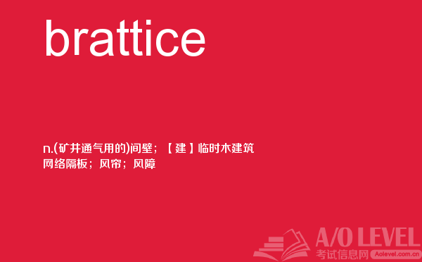 a-level的成绩分为a、b、c、d、e、u六个等级,a为最优,e为通过,u为不及格。如果学生对某门课的成绩不满意,可以选择重考,最终成绩以最好的一次为准。那么a-level考试想要取得a-level高分大家需要做到哪些呢?a/o-level考试网给大家带来的很多a-level考试经验,alevel考试技巧等等,想要考好a-level考试,不仅要知道这些,对于关于a-level考试的所有资讯都需要了解,最重点的是a-level词汇量的积累,今天a/o-level考试网就给大家带来的a-level的考试单词brattice的全面解析。如果您想了解alevel数学考试大纲,alevel考试网站,新加坡a水准试题,alevel考试考点等关于a-level考试的相关资讯,请继续浏览并关注课窝a/o-level考试网。