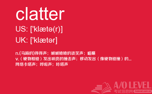 a-level的成绩分为a、b、c、d、e、u六个等级,a为最优,e为通过,u为不及格。如果学生对某门课的成绩不满意,可以选择重考,最终成绩以最好的一次为准。那么a-level考试想要取得a-level高分大家需要做到哪些呢?a/o-level考试网给大家带来的很多a-level考试经验,alevel考试技巧等等,想要考好a-level考试,不仅要知道这些,对于关于a-level考试的所有资讯都需要了解,最重点的是a-level词汇量的积累,今天a/o-level考试网就给大家带来的a-level的考试单词clatter的全面解析。如果您想了解新加坡a水准优势,国内alevel培训班,alevel学校名单,alevel真题网站等关于a-level考试的相关资讯,请继续浏览并关注课窝a/o-level考试网。