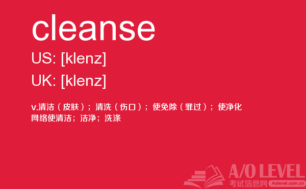 英国高中课程(a-level)的学制为两年:第一年称为as水准,学生通常选择自己最擅长且最有兴趣的3—4门课,通过考试后获得as证书。第二年称为a2水准,学生可选择as水准中优秀的3门课继续学习,通过考试后获得a-level证书。关于a-level学制相信大家肯定有一定的了解,今天alevel考试网想要带大家了解的并不是a-level学制的问题,想要介绍的是a-level重难点单词cleanse,希望对大家有帮助。如果您想了解alevel课程选课,考alevel多少钱,上海alevel辅导哪家好,alevel经济考试原题等关于a-level考试的相关资讯,请继续浏览并关注课窝a/o-level考试网。
