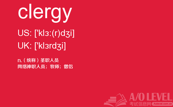 对于a-level考试,我们一再强调要加强a-level考试真题实战,多做英国a-level考试真题。放松一下,跟着a/o-level考试网来积累一下a-level考试中你会用到的单词clergy,对你的a-level考试会有很大的帮助。如果您想了解alevel数学真题2018,alevel真题下载,上海a水准培训,中国alevel成绩申请国外名校等关于a-level考试的相关资讯,请继续浏览并关注课窝a/o-level考试网。