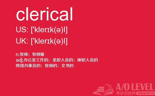 英国的大多数中学开设的alevel课程科目相当广泛,有文科、商科、经济、语言、数学、理科、计算、法律、媒体、音乐等。学生的alevel考试成绩及其所选修的a-level课程在很大程度上决定着能否进入理想的大学和学习所选择的学位课程。关于alevel考试alevel考试网会给大家带来和a-level考试相关的资讯,下面带来的是单词clerical的介绍,会对大家的a-level考试成绩有帮助。如果您想了解alevel写作,国际部高中课程alevel,怎么学新加坡a水准,alevel会计难吗等关于a-level考试的相关资讯,请继续浏览并关注课窝a/o-level考试网。