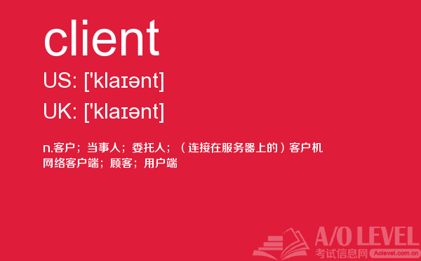 为了有a-level考试高分,很多童靴都参加英国高中课程a-level考试前都会做很多a-level考试真题。a-level考试备考要有一定的方法,课窝a/o-level考试网每天都会给大家带来a-level考试资讯,a-level考试备考相关的内容,今天课窝a/o-level考试网小编给大家带来关于a-level单词client的详细介绍。如果您想了解如何成为alevel老师,alevel补习,alevel数学教材有几本书,alevel数学评分标准等关于a-level考试的相关资讯,请继续浏览并关注课窝a/o-level考试网。