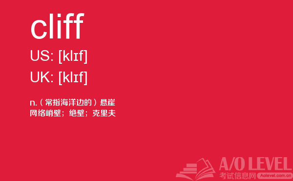 英国a-level考试是英国留学生去英国留学需要参加的考试,很多考生担心a-level考试分数要求高,英国a-level考试难度大,别担心,只要认真的学习a-level考试内容,小编相信大家一定能够考得a-level高分。今天a/o-level考试网给大家带来单词cliff的全面解析。如果您想了解爱德思alevel答案,a水准成绩,新加坡a水准数学考试,alevel培训费等关于a-level考试的相关资讯,请继续浏览并关注课窝a/o-level考试网。