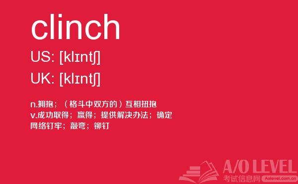 就读于国内学校的学生, 在申请英国学校时需要提交英国a-level考试成绩。很多考生因此英国a-level考试搞得头疼,放松一下,跟着a/o-level考试网来看看英国留学资讯吧!今天课窝a/o-level考试网小编给大家带来a-level考试重点词汇clinch的全解,对你肯定有帮助。如果您想了解alevel网课,alevel官网,alevel培训费用,alevel化学知识点整理等关于a-level考试的相关资讯,请继续浏览并关注课窝a/o-level考试网。
