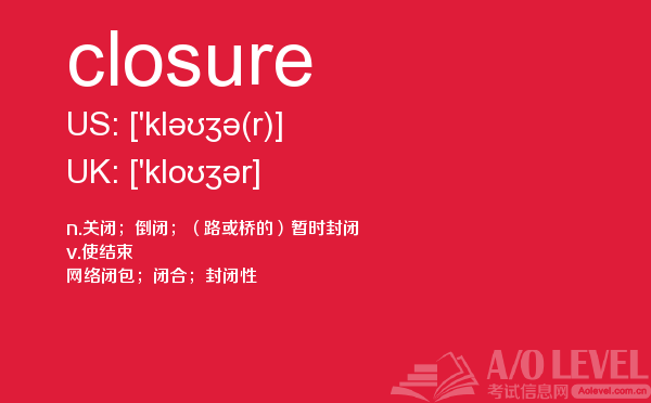 a-level词汇量受到的关注越来越高,很多家长担心a-level考试培训费用,a-level考试录取竞争会不会越来越激烈?这些问题在课窝a/o-level考试网小编都会给大家带来详细介绍,今天a/o-level考试网小编给大家带来的是在a-level考试中的重点词汇closure的详细介绍。如果您想了解alevel怎么自学,a水准数学,alevel考试指南,alevel自学选什么等关于a-level考试的相关资讯,请继续浏览并关注课窝a/o-level考试网。