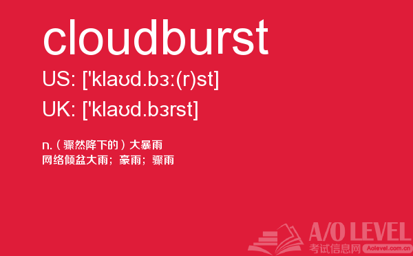 课窝a/o-level考试网上提供了许多信息可以供考生们参考,比如考生需要在此网站报名,打印准考证,或者搜寻与英国a-level考试内容相关的资料等等。考生如果想在短时间内,迅速掌握a-level考试资讯,就需要合理运用此网站的信息。今天带来的是a-level考试词汇之cloudburst的详细介绍。如果您想了解alevel法律,alevel数学考试大纲,alevel课程多久,alevel中文书目等关于a-level考试的相关资讯,请继续浏览并关注课窝a/o-level考试网。