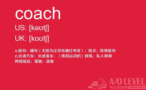 英国a-level考试是英国留学生去英国留学需要参加的考试,很多考生担心a-level考试分数要求高,英国a-level考试难度大,别担心,只要认真的学习a-level考试内容,小编相信大家一定能够考得a-level高分。今天a/o-level考试网给大家带来单词coach的全面解析。如果您想了解alevel报名截止日期,alevel美术课程,alevel可以申请哪里,alevel中学等关于a-level考试的相关资讯,请继续浏览并关注课窝a/o-level考试网。