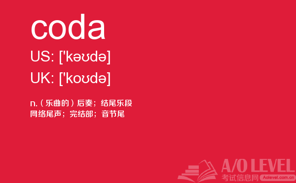 对于a-level考试,我们一再强调要加强a-level考试真题实战,多做英国a-level考试真题。放松一下,跟着a/o-level考试网来积累一下a-level考试中你会用到的单词coda,对你的a-level考试会有很大的帮助。如果您想了解alevel考试用品,alevel写作真题,alevel词汇书,alevel非全日制培训等关于a-level考试的相关资讯,请继续浏览并关注课窝a/o-level考试网。
