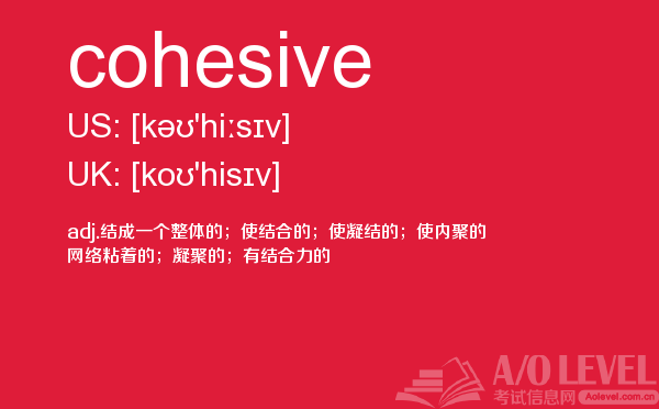 a-level课程适用于年龄在15—18之间,初中毕业以上的在校中学生或具有同等学历的职高生,通常国内a-level学校招收的是高二毕业的学生,并要求参加相关的入学考试,由于a-level课程包括教学及试卷习题等都是英文形式出现,所以这要求学生有较高的英文水平。对于a-level考试适用对象有初步了解之后,下面alevel考试网给大家带来的alevel考试中你需要重点记住的单词cohesive的详细介绍。如果您想了解alevel成绩申请国外名校,英国alevel好学吗,a水准考试难度,alevel教材代购等关于a-level考试的相关资讯,请继续浏览并关注课窝a/o-level考试网。