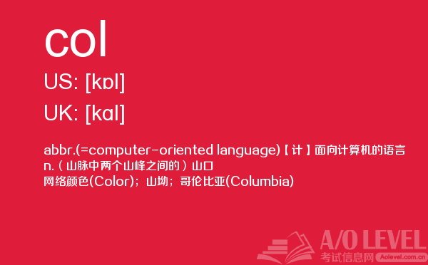 现在很多人来咨询a-level考试录取率,英国a-level考试题库的家长也依然不减,而考生们则更关心a-level教材以及a-level考试培训课程是什么样的。a/o-level考试网都会解答您。今天小编带来a/o-level考试网的内容是关于a-level词汇的col单词的详细介绍。如果您想了解alevel网上报名,alevel国际课程介绍,新加坡a水准学费,alevel范文等关于a-level考试的相关资讯,请继续浏览并关注课窝a/o-level考试网。
