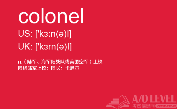 英国留学考试a-level考试考什么?a-level考试题型一定要注意积累和总结。课窝a/o-level考试网小编每天会给大家带来a-level考试的相关资讯,今天带来a-level单词colonel的解析,希望大家认真的积累a-level考试词汇。如果您想了解alevel考试评分标准,alevel物理测试题,alevel考试登记,南京alevel中心等关于a-level考试的相关资讯,请继续浏览并关注课窝a/o-level考试网。